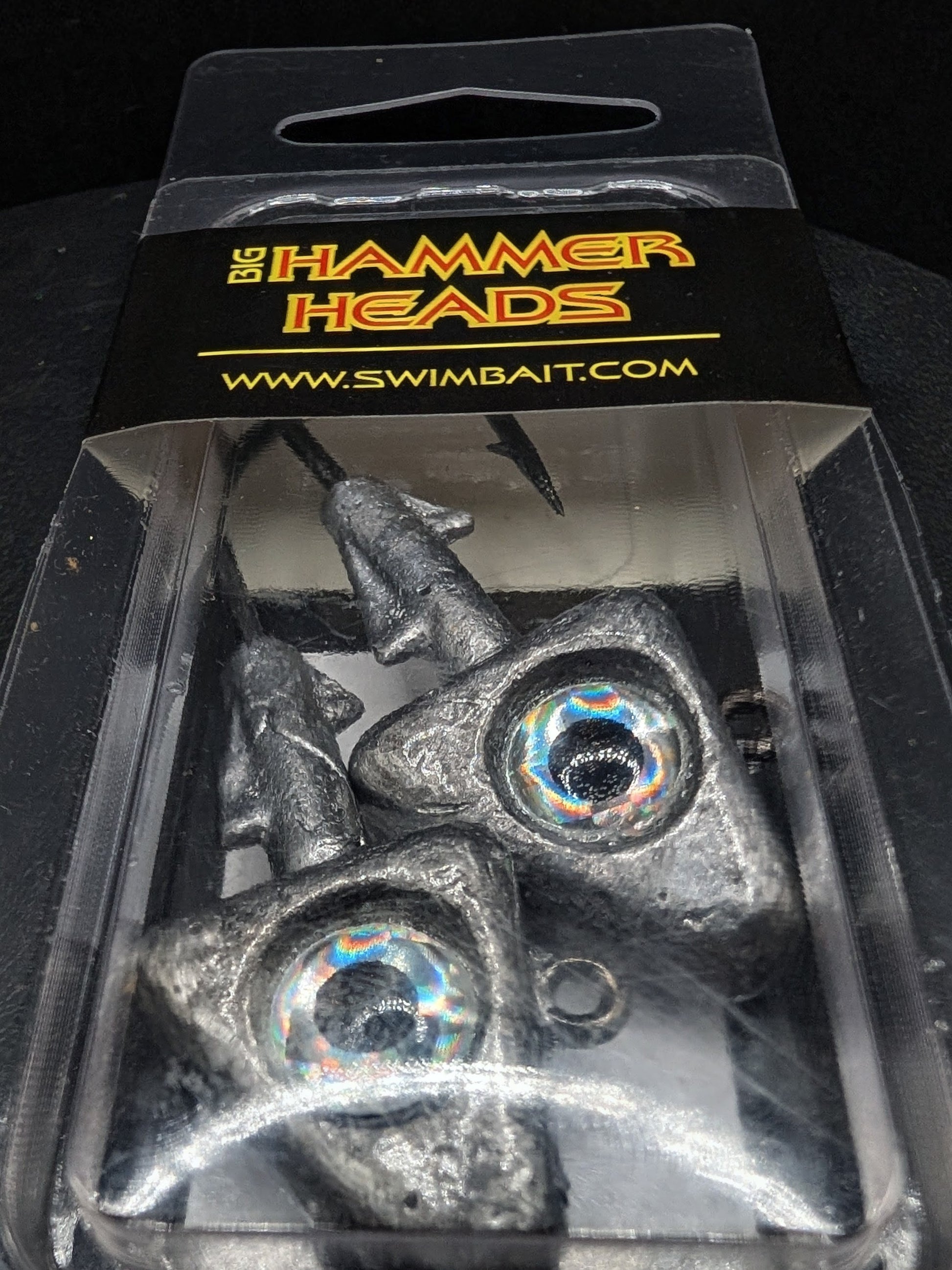 This listing is for a genuine Big Hammer Heads® jig head set made by Sunrize Tackle, sold as a 2-pack of 1 oz jig heads. These jig heads feature a heavy-duty lead head design with large 3D eyes and a strong hook, commonly used for rigging soft plastic swimbaits.