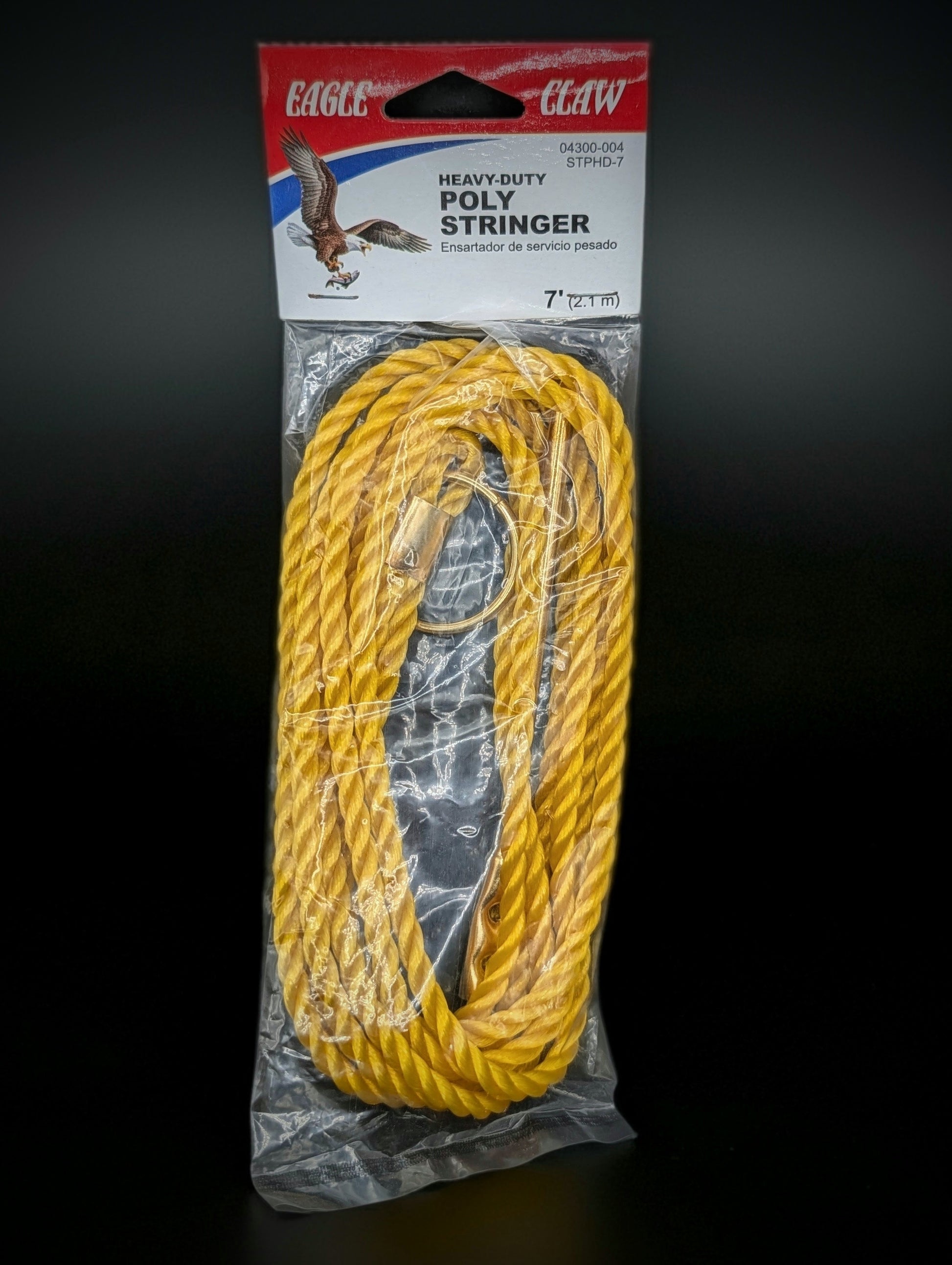 This listing is for a genuine Eagle Claw® Heavy-Duty Poly Stringer, measuring 7 feet (2.1 m) in length. This stringer is designed for securing and holding fish in the water and features a durable poly rope construction with metal hardware.