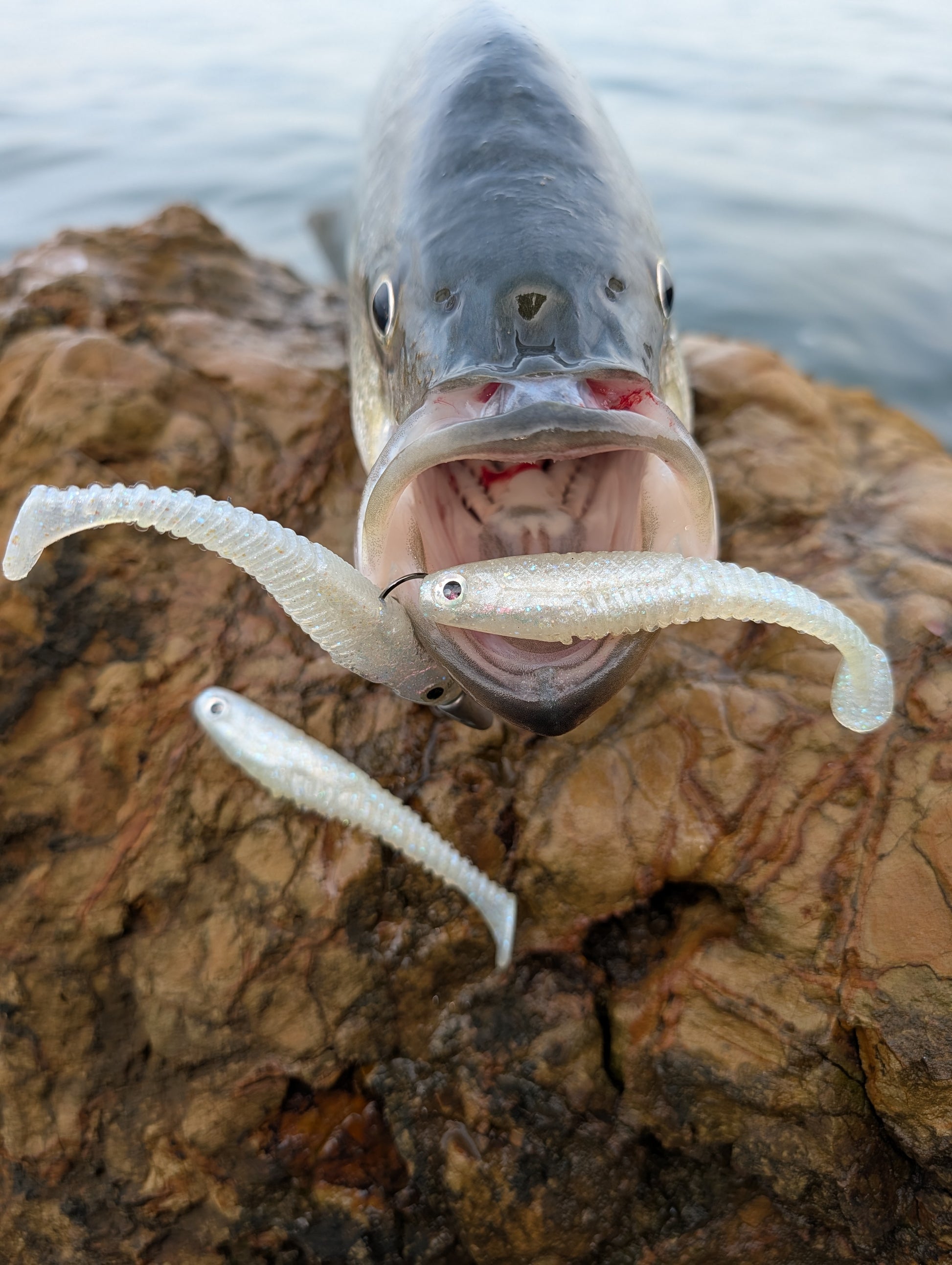 The White Hollowtip is a versatile, hand-poured swimbait designed for clear or low-light conditions where contrast and visibility matter most. Its solid white body delivers a strong silhouette in the water, drawing attention from halibut, striped bass, and other predatory fish.