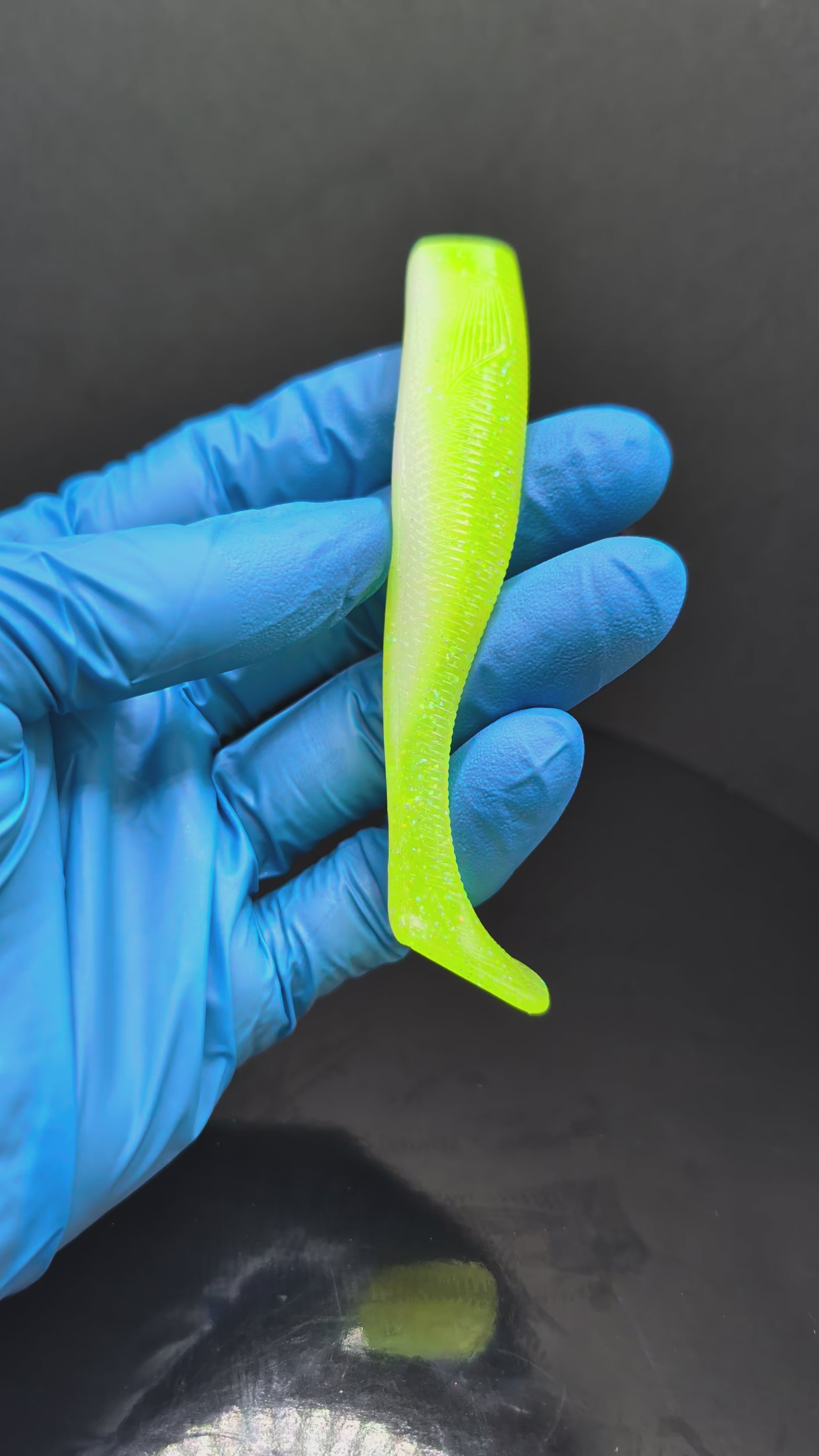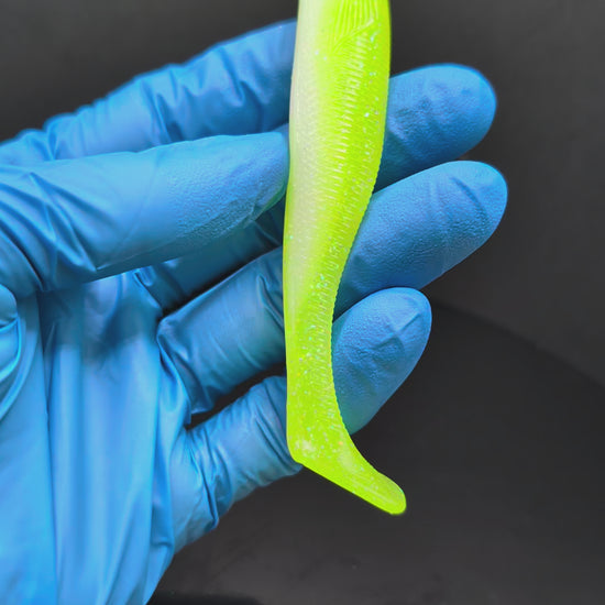 The high-contrast white and chartreuse color combination is a Bay Area staple, known for triggering reaction strikes from striped bass, halibut, and other inshore predators. The paddle tail produces a strong thump and consistent swimming action at a wide range of retrieve speeds—perfect for jig heads, underspins, and weedless rigs.