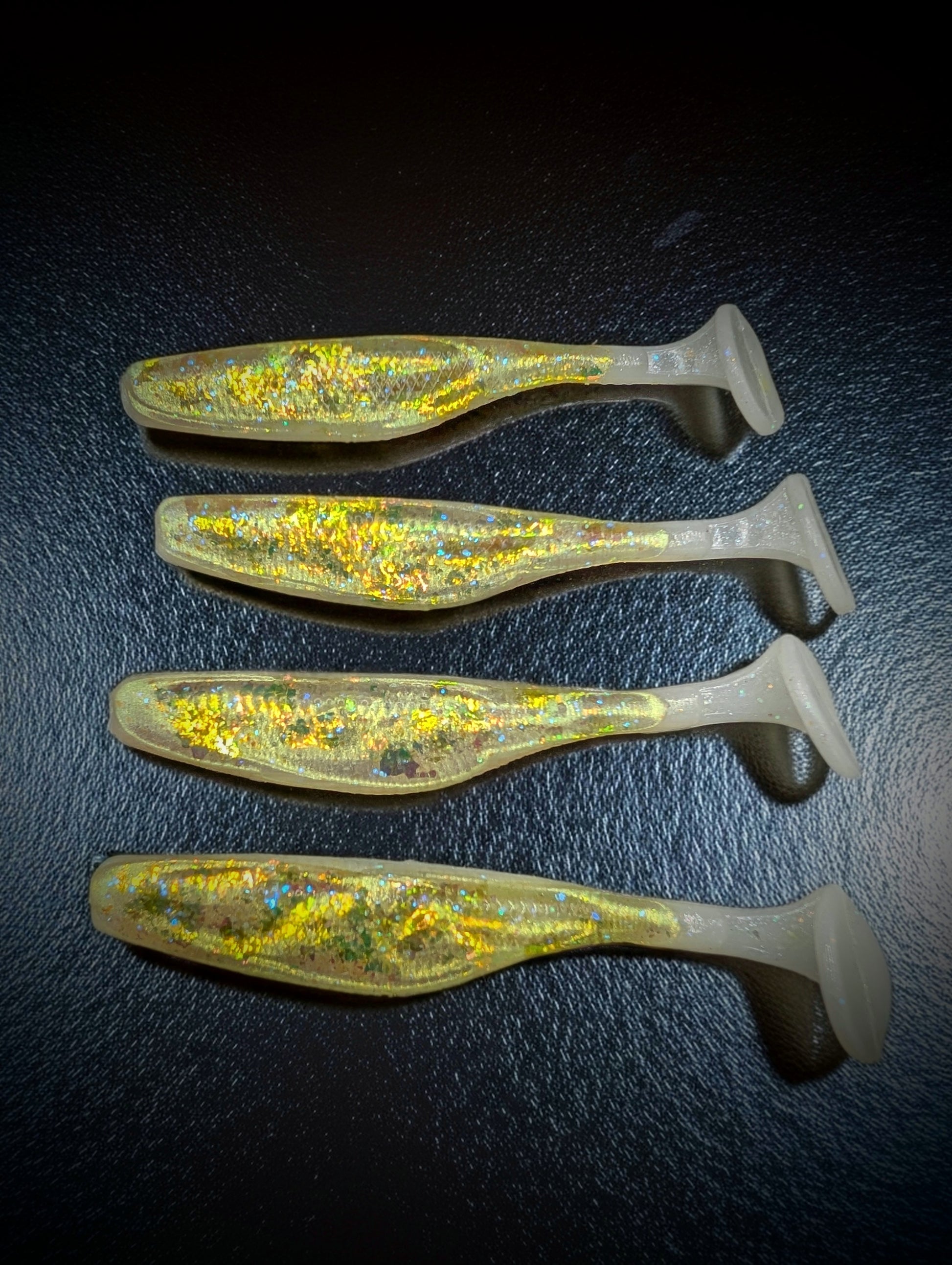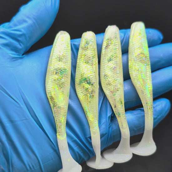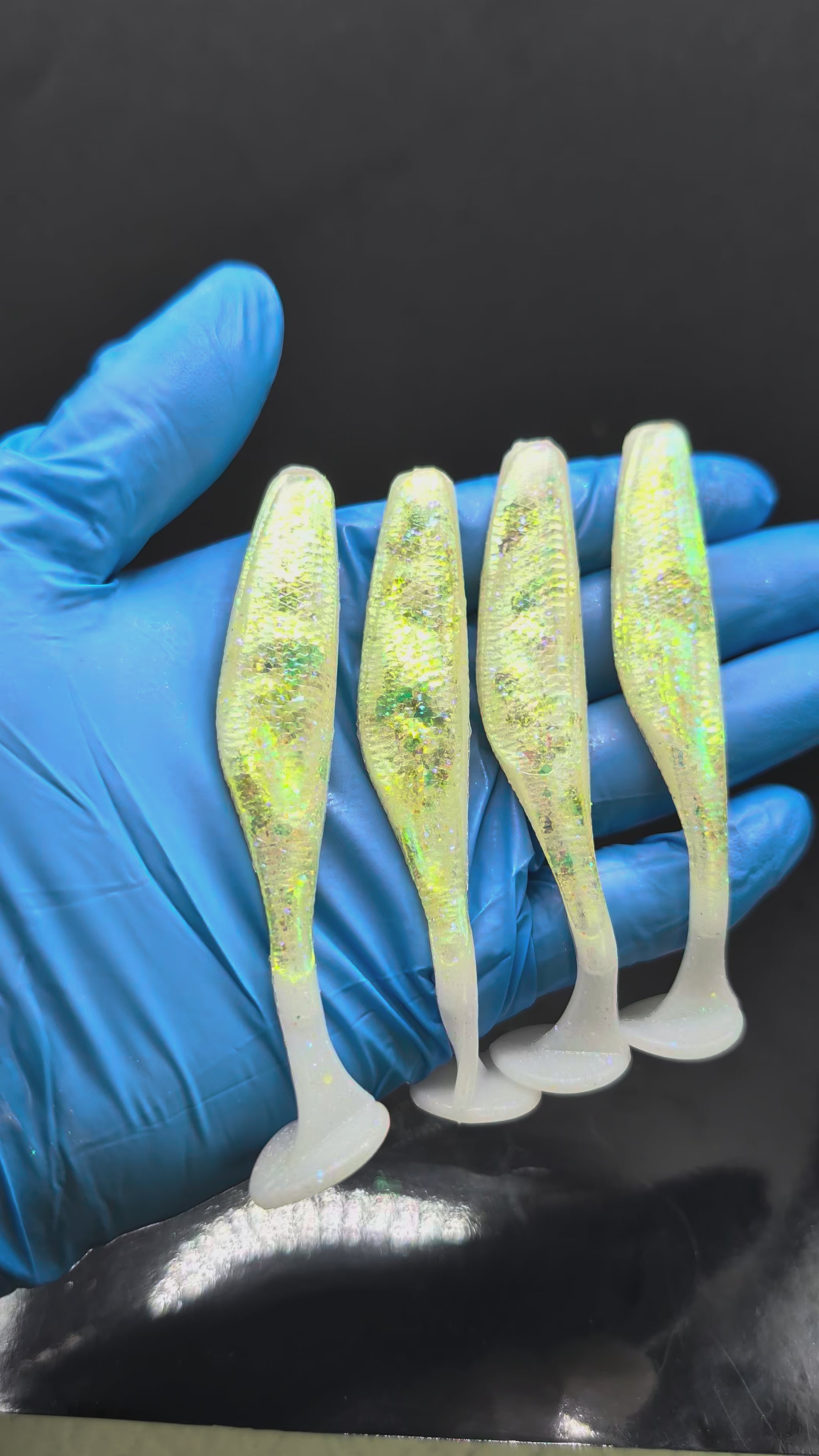- Color: White base & tail with gold/chartreuse flake and luminescent holographic skin